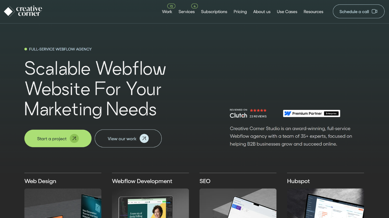 One such model is their "All-in-One Subscription," designed for mid-market businesses and startups that lack an in-house web team. Under this plan, Creative Corner provides continuous design, iteration, and optimization of a Webflow site on a monthly basis. This allows brands to treat the agency as a versatile extension of their own team.