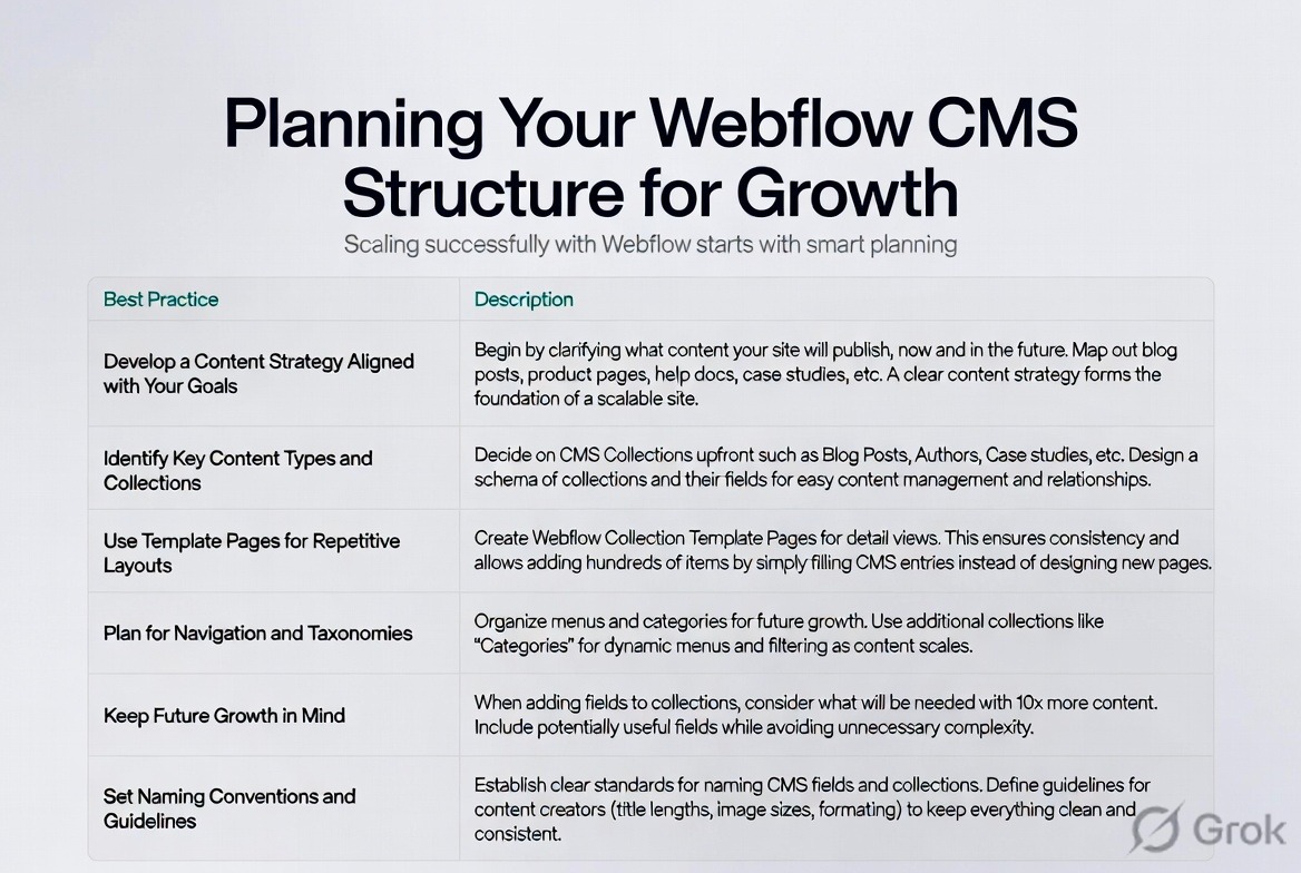 Scaling successfully with Webflow starts with smart planning. Before you jump into designing pages, it’s crucial to architect your CMS collections and content strategy with future growth in mind. Here’s how to set up Webflow CMS for a scalable startup website: