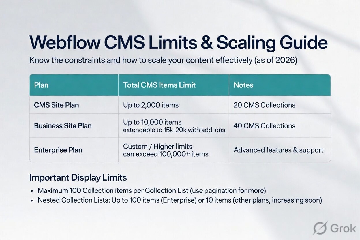 A: The main limit to be aware of is the number of CMS items per site: 2,000 items on the CMS plan and 10,000 on the Business plan. If you approach these limits, you have a few options. First, you can optimize content by merging collections or archiving old items. Webflow also introduced add-ons for CMS items in 2024, so Business plan users can pay to increase the item cap beyond 10k. If your needs far exceed that, the Enterprise plan offers custom limits. If you do hit the limit, Webflow will prevent you from adding new items until you upgrade or reduce content.