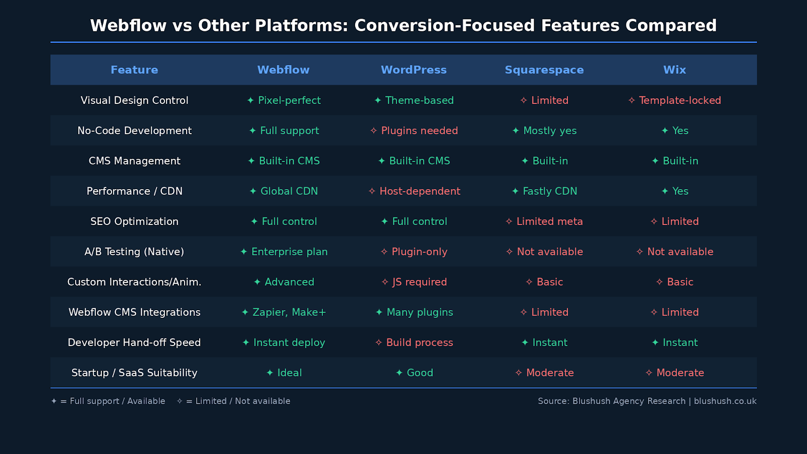 As one of the top Webflow agencies 2026, we're often asked how Webflow stacks up against other platforms for conversion-focused builds. The table below and the detailed comparison image that follows captures the key differences for teams making a webflow agency comparison 2026 decision: