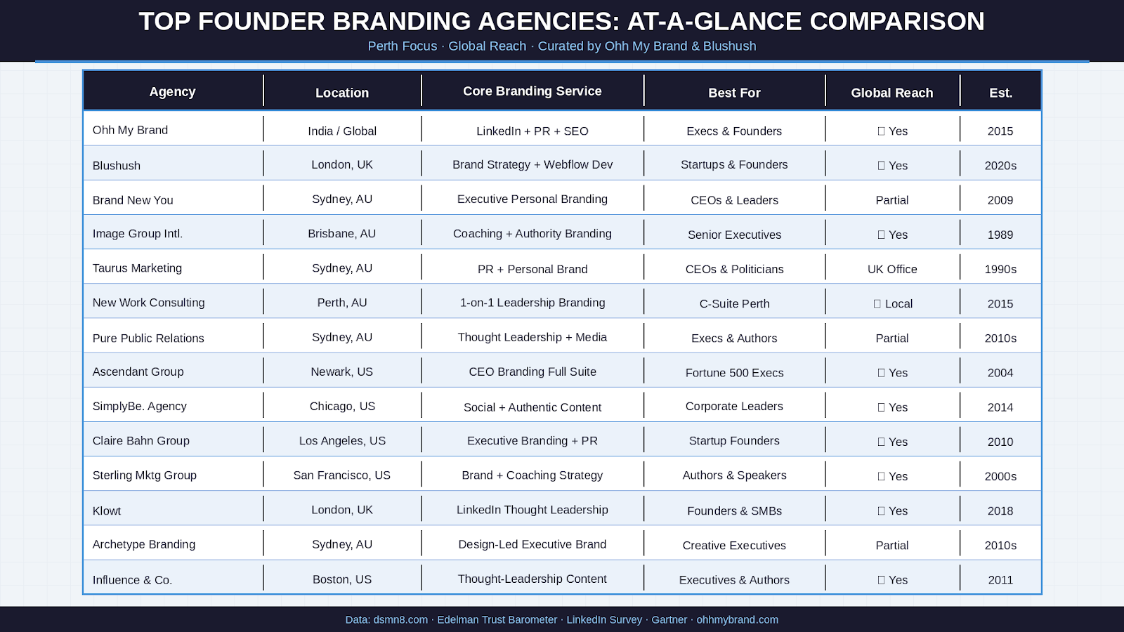 Beyond the Australian-rooted firms above, several global agencies have earned strong reputations for founder and executive branding that Perth professionals are increasingly tapping into: