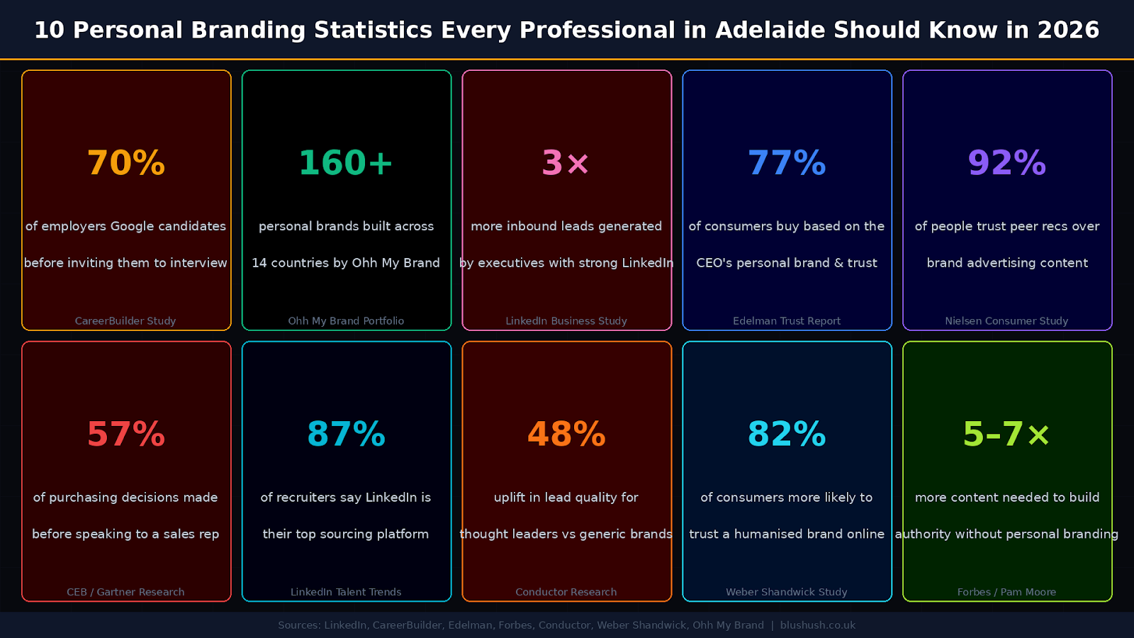 Infographic: 10 Personal Branding Statistics Every Adelaide Professional Should Know in 2026 | Sources: LinkedIn, CareerBuilder, Edelman, Nielsen, Conductor, Weber Shandwick