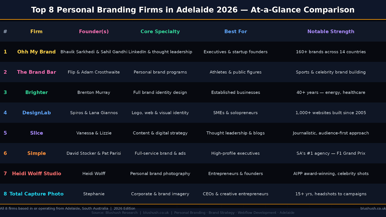 Adelaide's personal branding landscape in 2026 offers world-class talent across strategy, content, photography, and digital execution. Whether you choose Ohh My Brand for thought leadership and LinkedIn strategy, Brighter for a full brand identity overhaul, Heidi Wolff Studio for photography that captures your essence, or Blushush for a high-performance Webflow sites build that brings your brand to life online the investment is the same: a decision to be seen, to be trusted, and to be remembered.