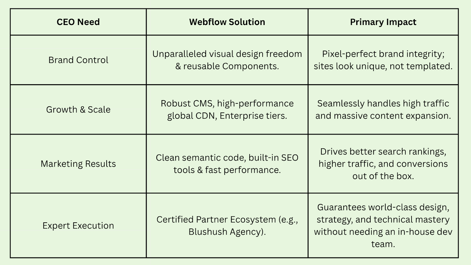 Ultimately, Webflow amplifies a brand’s voice online. A CEO invests in Webflow when they want a site that feels like their brand, not just looks “good enough.” As Blushush’s Sahil Gandhi says, their philosophy is “Forget Boring”, a mantra only possible when the platform is truly flexible. The result is a website that is a digital extension of the brand, driving memorability and trust with every pixel.